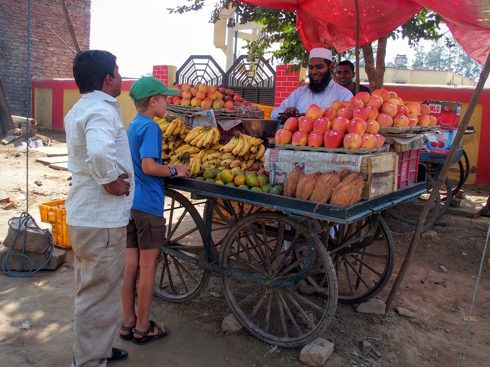 The journey there and back, turned out to be no short excursion taking more than an hour each way. Tuk-tuk trips, though, are usually fun, at least when we don't have our four big backpacks on our laps and wedged in behind our heads and shoulders. We generally sit three in back and one (usually Dex) in front next to the driver. The other day, we saw no fewer than eight people crammed into one, plus a young boy hanging onto the back. When we were in London and Paris with little Cole, he would always point out the “Bad Guys,” bikers or motorcycle riders without helmets. Here in India we see and awful lot of Bad Guys on bikes and motorcycles. It is totally normal to see women sitting side saddle behind their husbands, a young child in their arms and a second young child straddling the gas tank.